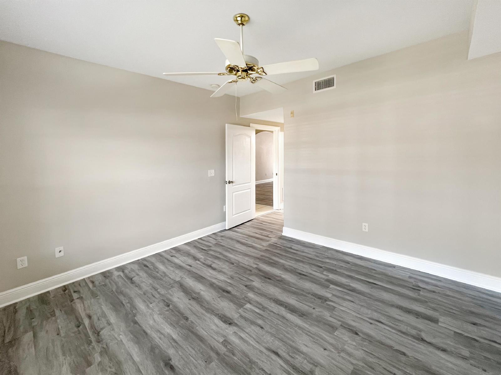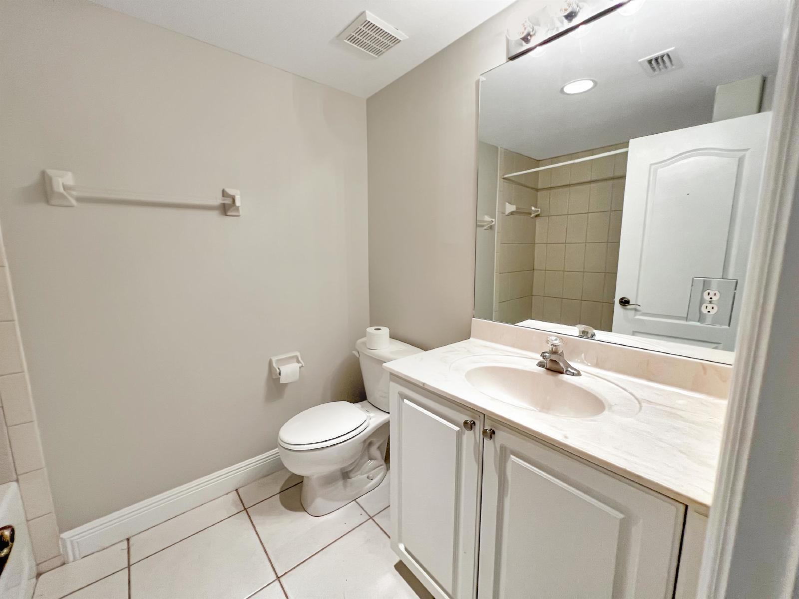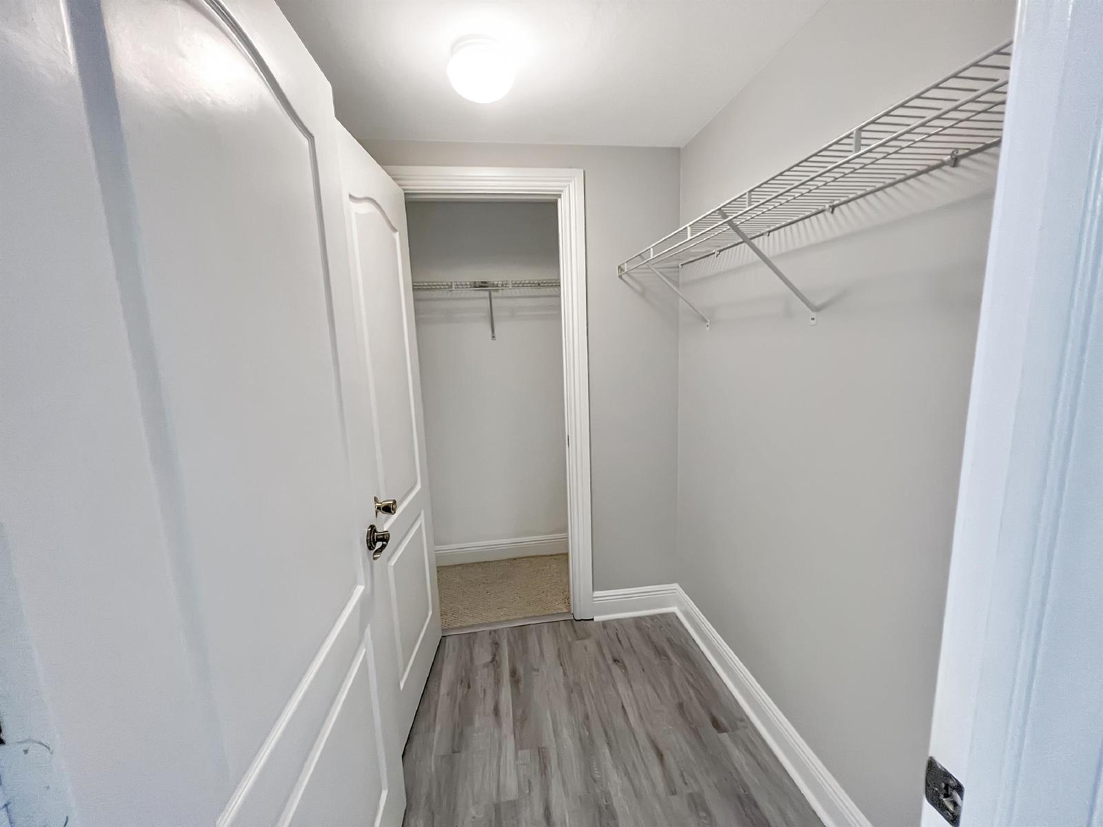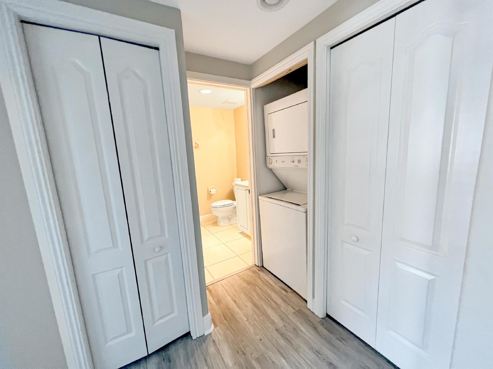 The master suite includes a walk-in closet and an ensuite bathroom for added convenience. The second bedroom is generously sized and can be used as a guest room or office. Both bathrooms are updated with contemporary fixtures and finishes.