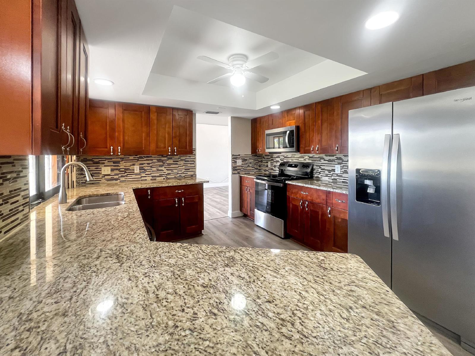 The modern kitchen is a focal point, equipped with top-of-the-line appliances, ample cabinetry, and a convenient breakfast bar, making it perfect for culinary enthusiasts and entertaining guests. Adjacent to the kitchen is a cozy dining area.