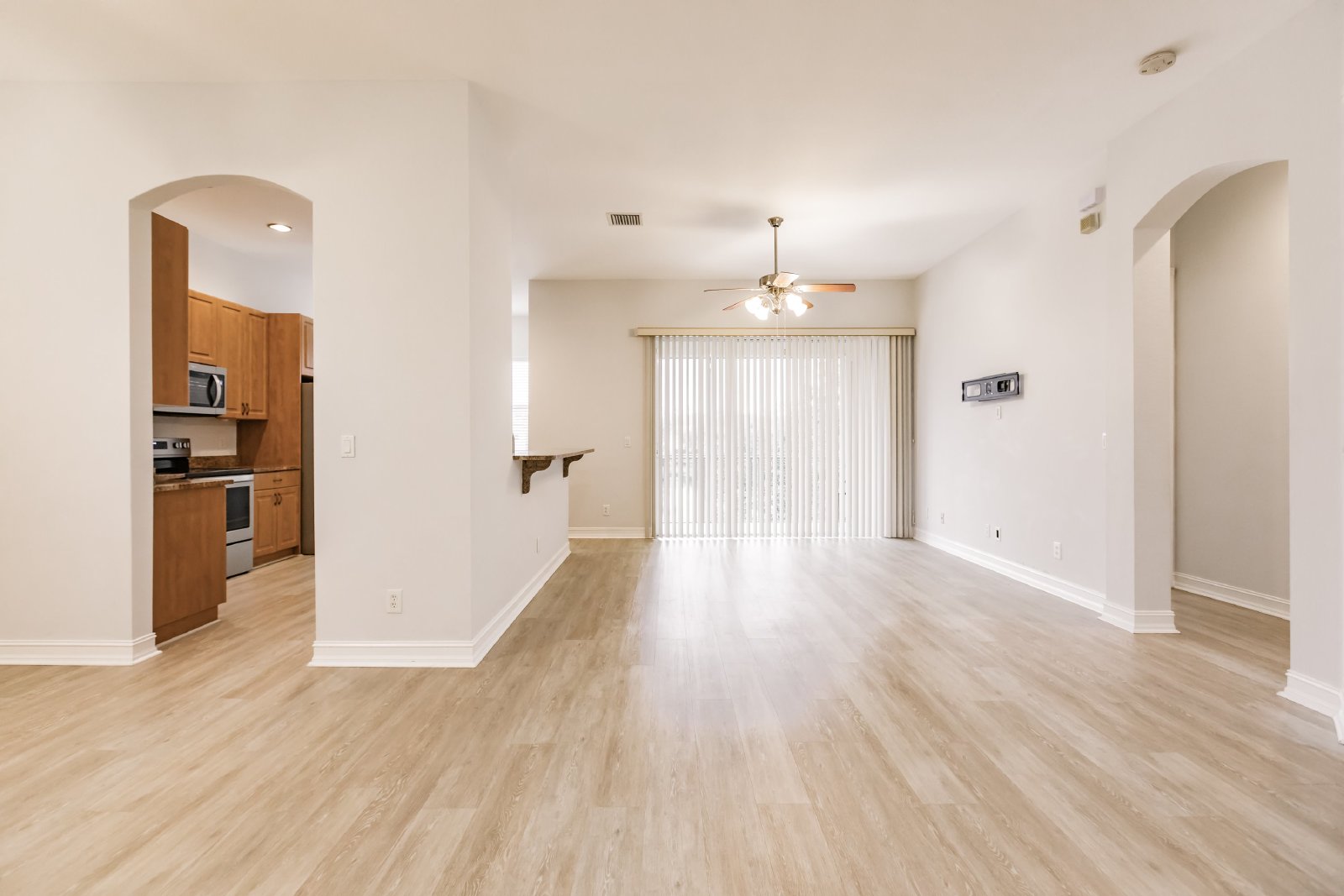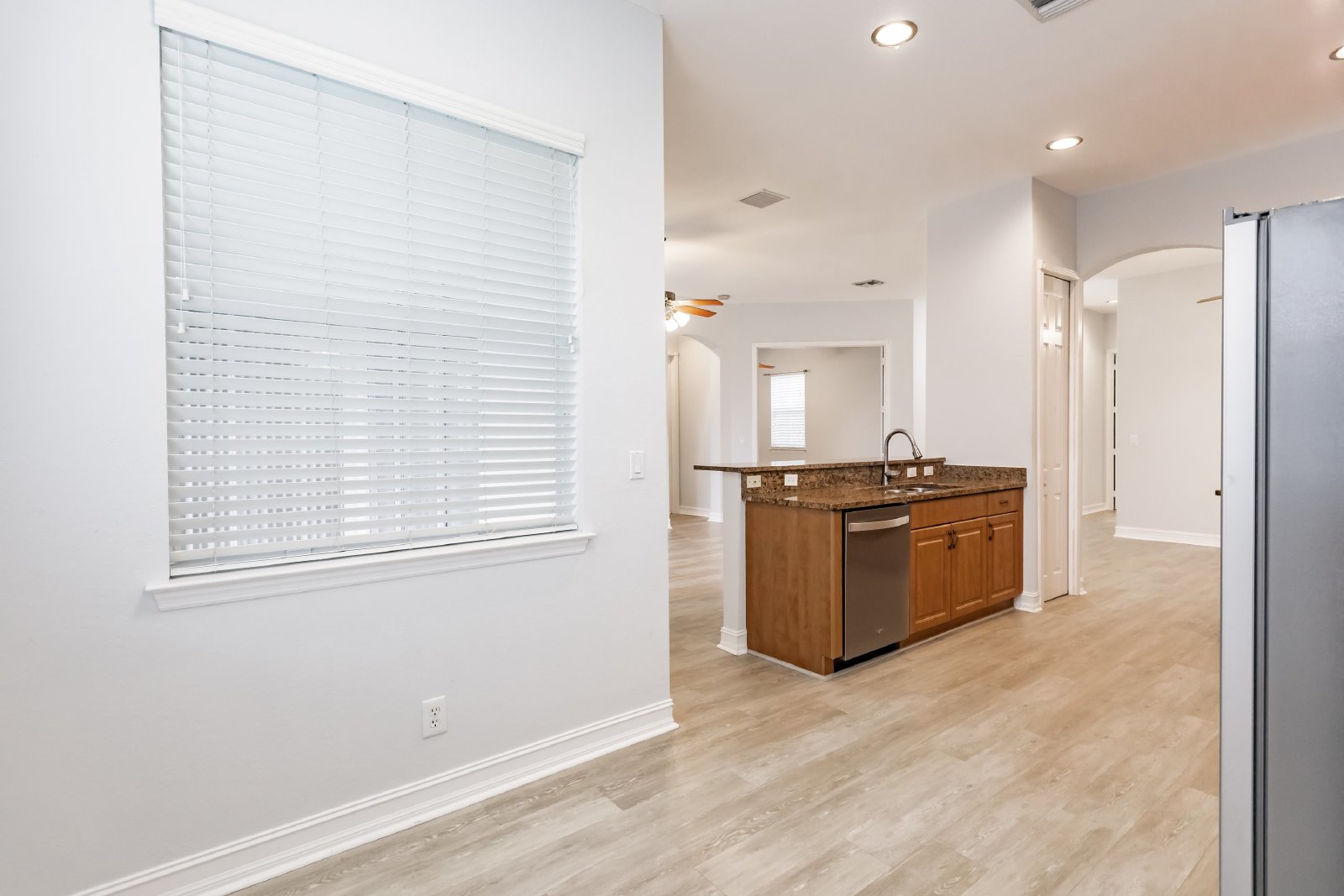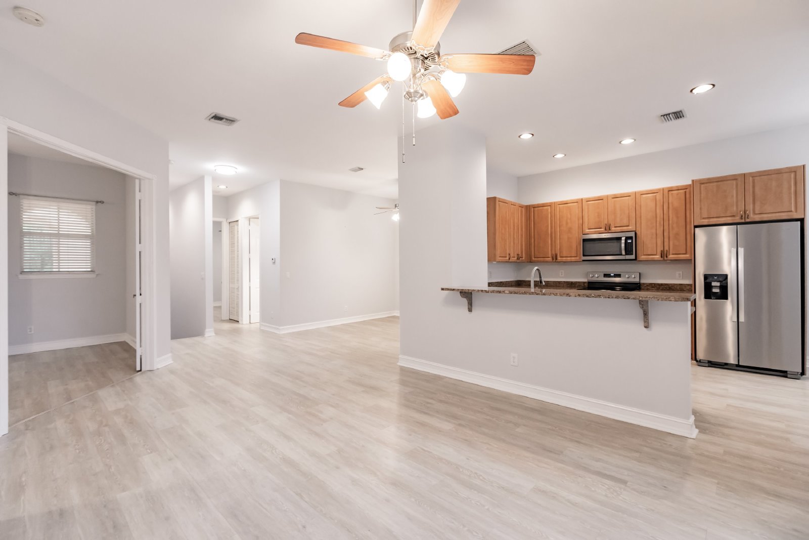 Upon entering, you are greeted by an open floor plan that seamlessly connects the living, dining, and kitchen areas. The well-appointed kitchen features contemporary appliances, ample cabinet space, and a convenient breakfast bar.