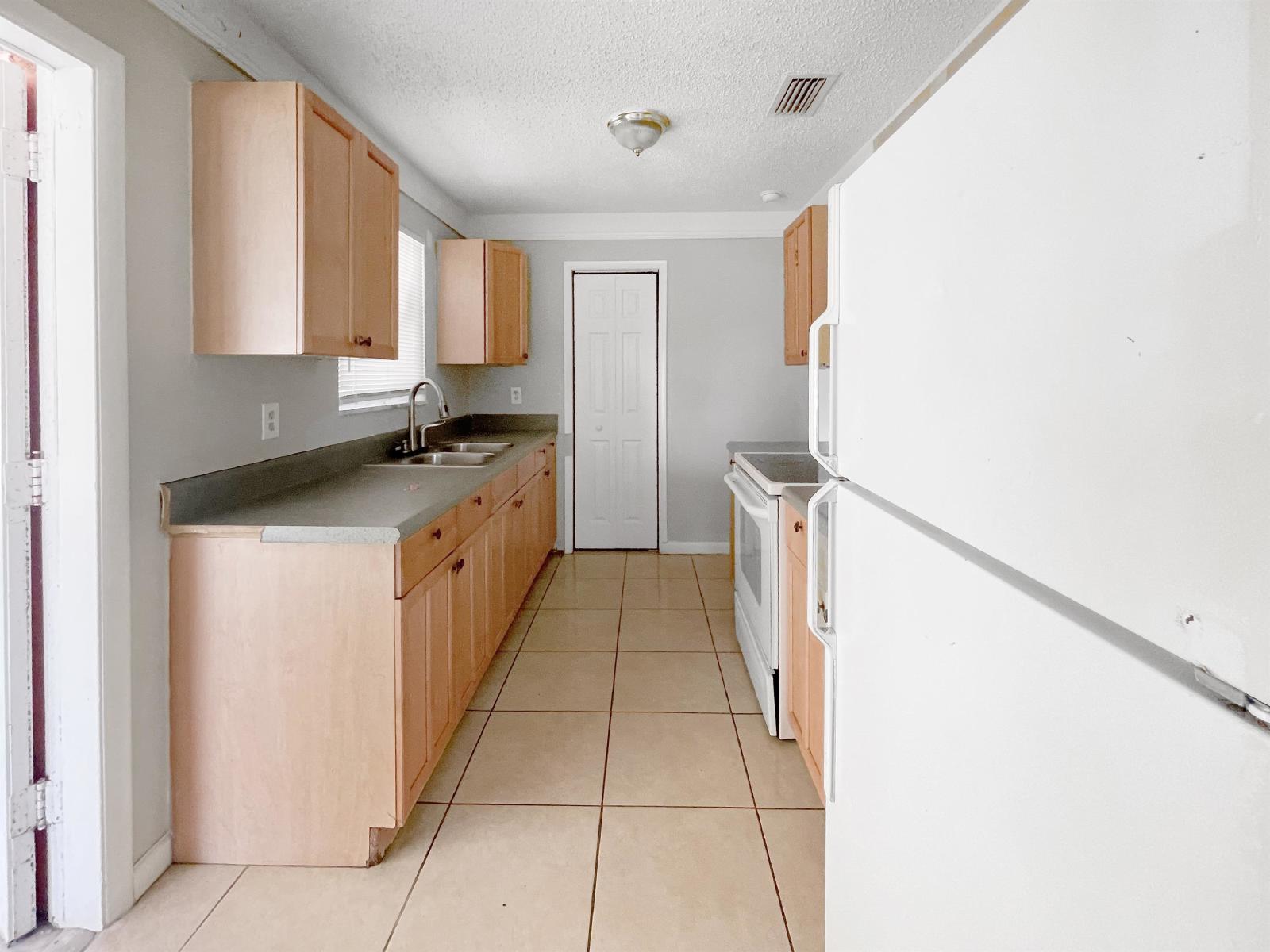 Step inside to discover a bright and airy interior featuring an inviting living area, perfect for relaxation. The adjacent kitchen is equipped with essential appliances and ample cabinet storage.