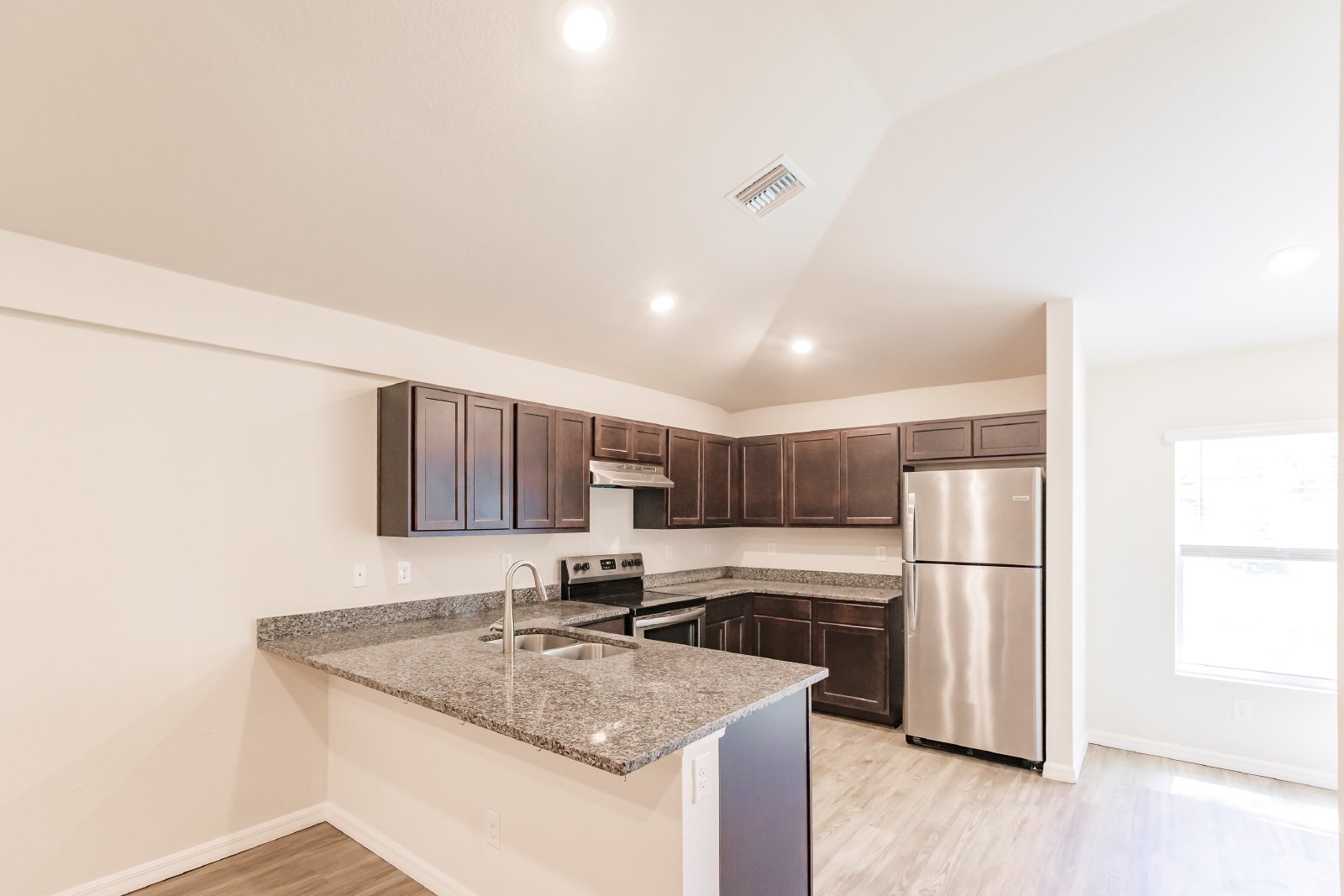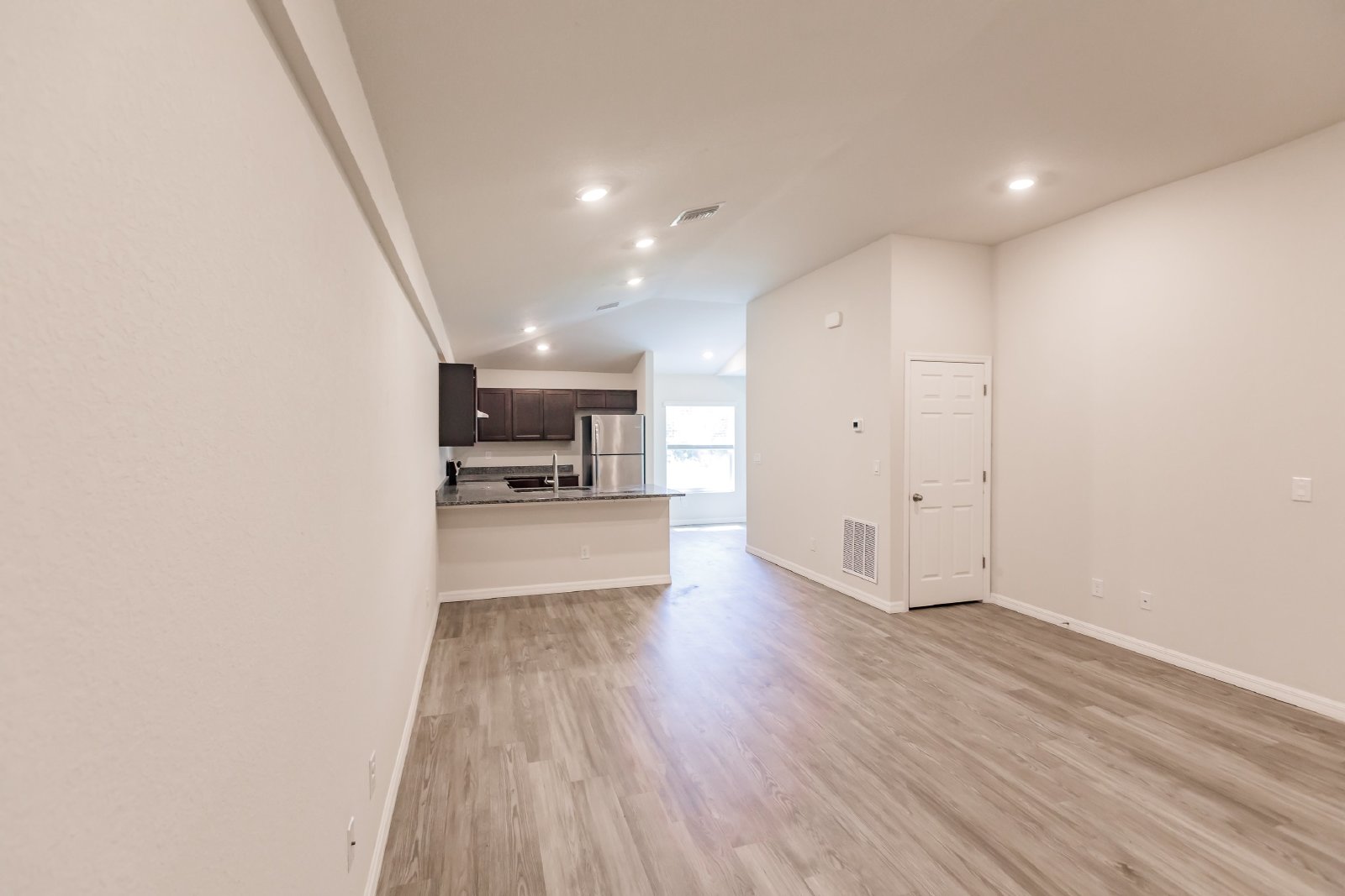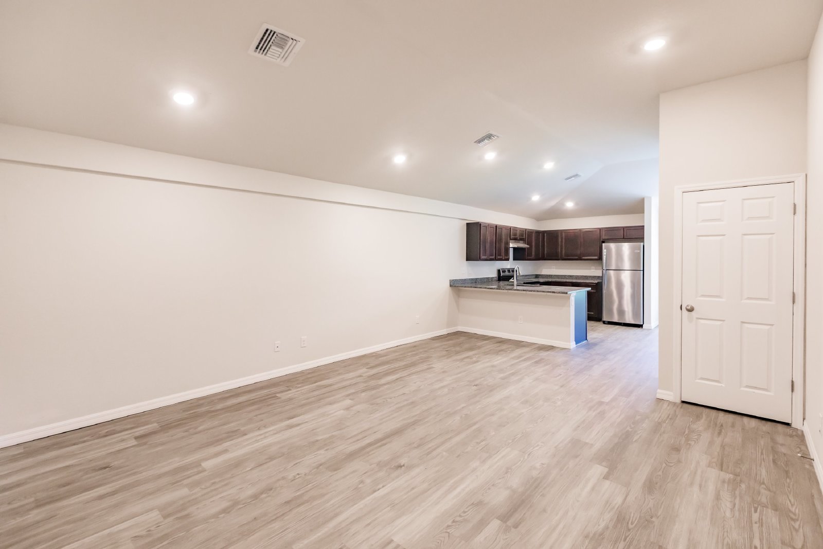 The open floor plan includes a cozy living room, a well-appointed kitchen with modern stainless steel appliances, and a dining area for entertaining.