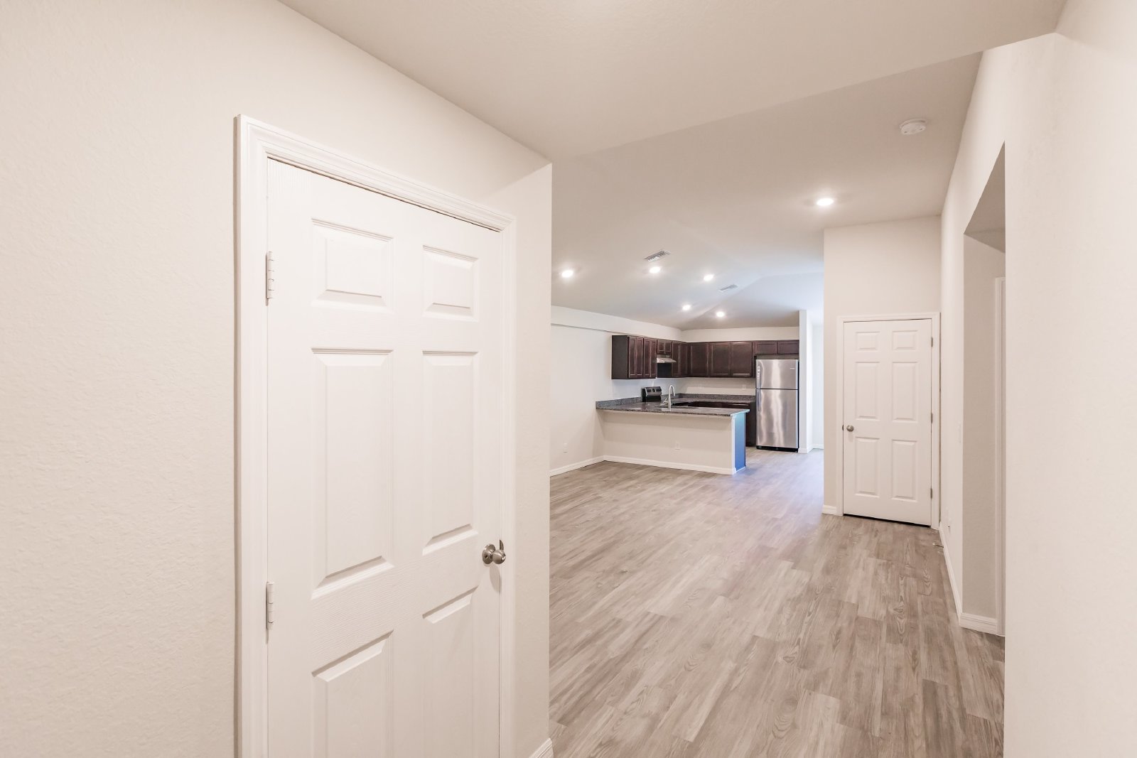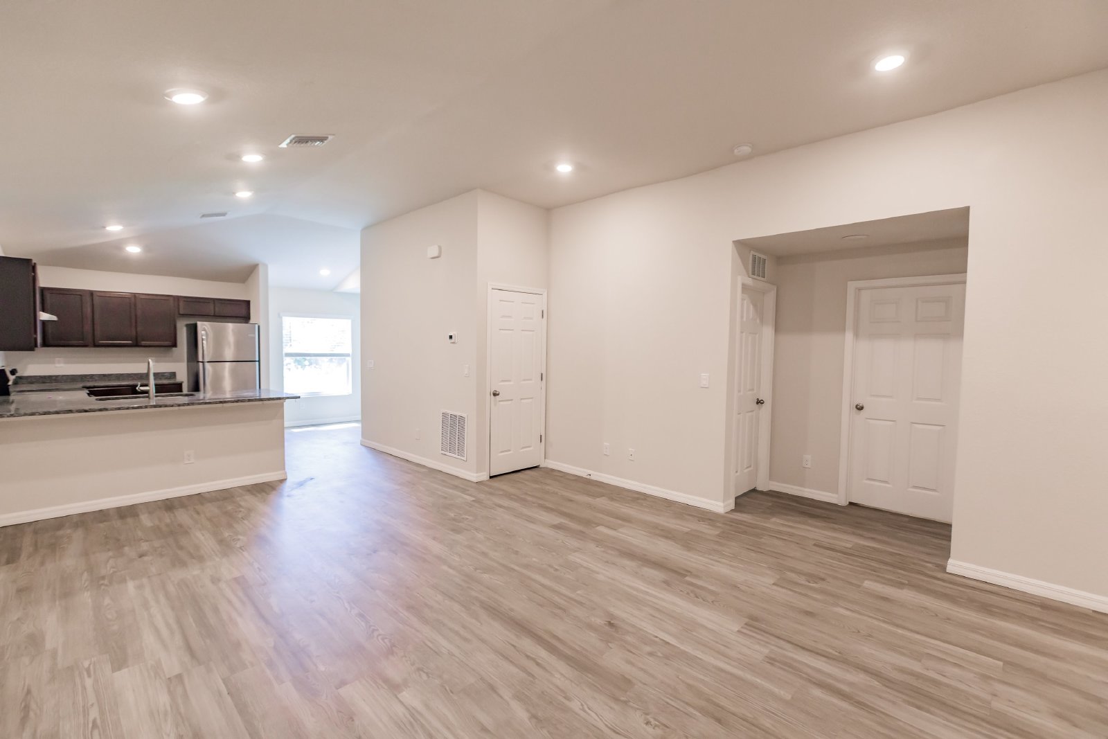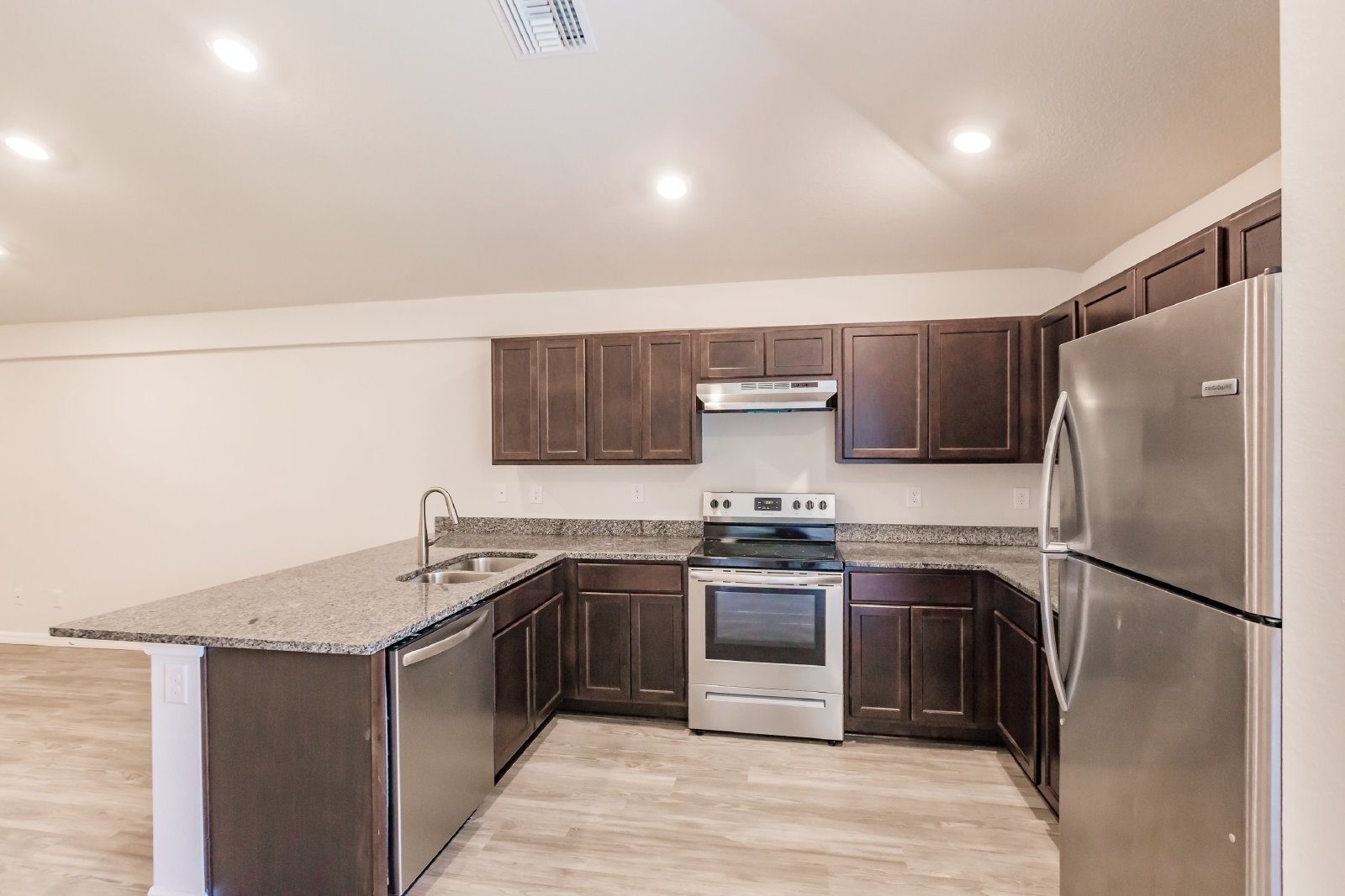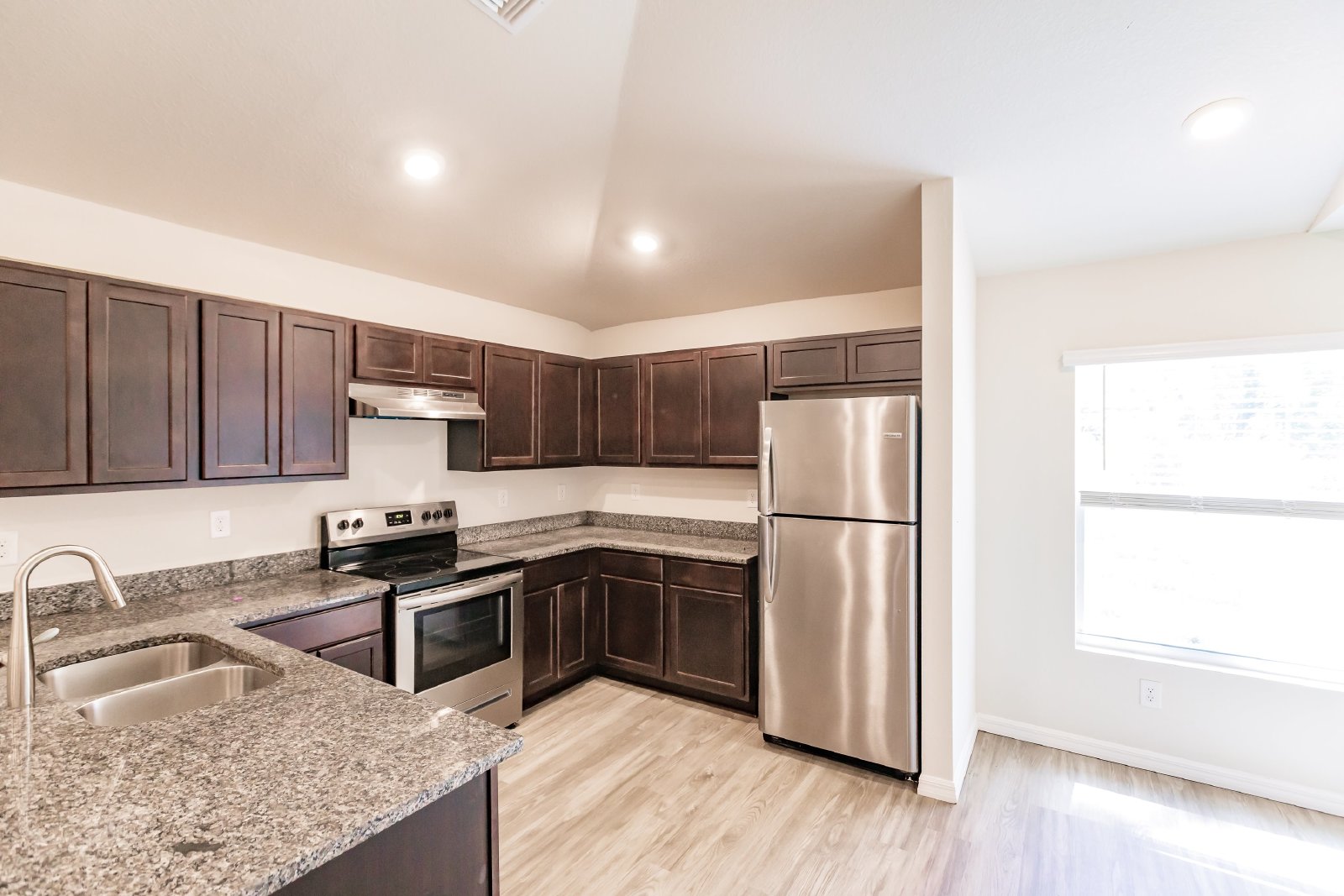 The open floor plan includes a cozy living room, a well-appointed kitchen with modern stainless steel appliances, and a dining area for entertaining.