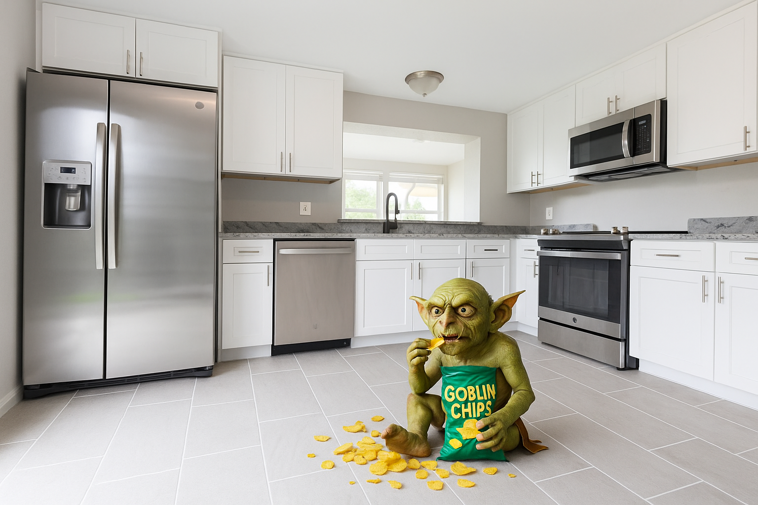 In the heart of the home, the chef’s kitchen gleams with stainless steel cauldrons (appliances), granite countertops, and white shaker cabinetry, perfect for preparing hearty feasts or crafting late night potions. The open dining and living areas are ideal for hosting goblin gatherings, celebrating victories, or simply enjoying the quiet hum of your enchanted domain.